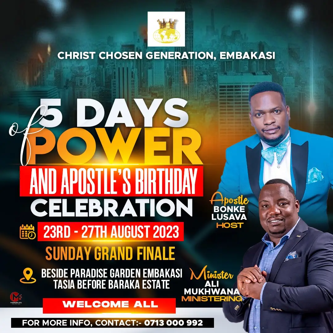 Join me in a remarkable event, “5 Days of Power,” hosted by Apostle Bonke Lusaka at Christ Chosen Generation, Embakasi. From August 23rd to 27th, we’ll experience inspiring worship and celebrate Apostle’s birthday. I’ll be ministering on Sunday, the grand finale. Find location details on my website. Looking forward to an incredible time of faith and fellowship.