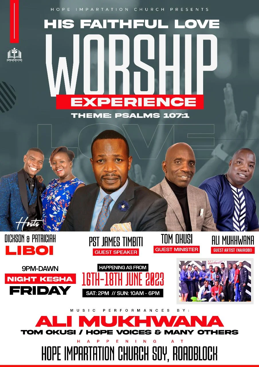 Welcome to the “His Faithful Love Worship Experience”! I, Ali Mukhwana, joyfully invite you to join us at Hope Impartation Church Soy, Roadblock, from 16th-18th June 2023. Hosted by Pst Dickson & Patriciah Liboi, this event promises a powerful Kesha on Friday at 9pm, followed by a weekend filled with soul-stirring worship and inspiring messages. Together, we’ll encounter God’s unwavering love, igniting our spirits and drawing us closer to Him. Let us gather as a community, united in our pursuit of His faithful love. Come with expectant hearts, ready for a transformational experience in the presence of our Heavenly Father.