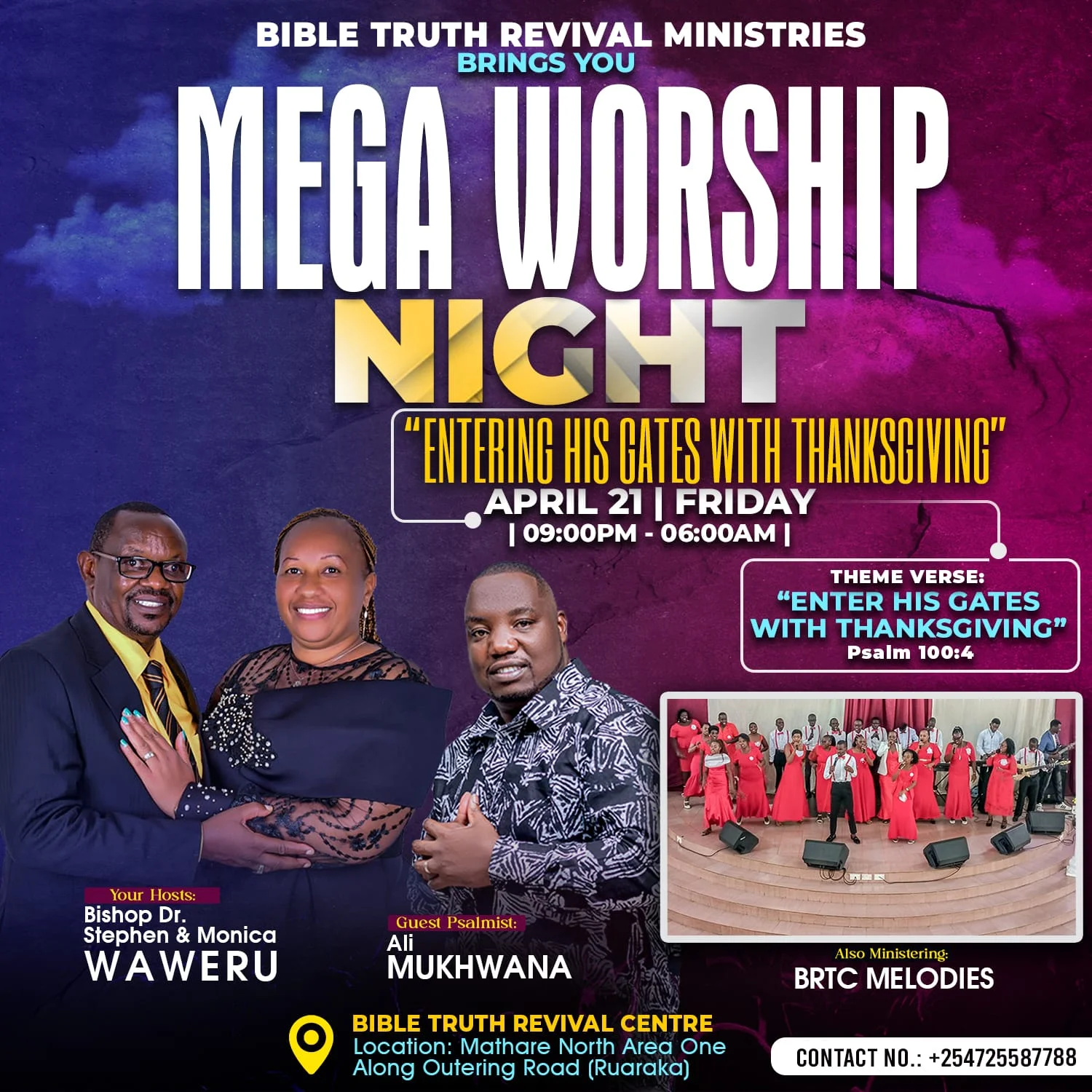 We are thrilled to welcome you to the Mega Worship Night at Bible Truth Revival Centre on April 21, 2023, where we will be joined by the celebrated gospel musician Ali Mukhwana.