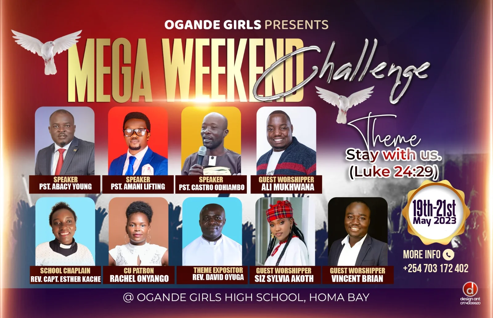 It is with great pleasure that I welcome you to the Ogande Girls Mega Weekend Challenge! Join us on May 19th to 21st, 2023 for an unforgettable time of worship, fellowship and spiritual growth. Our theme is “Stay with Us”, a powerful reminder of God’s unwavering presence in our lives.